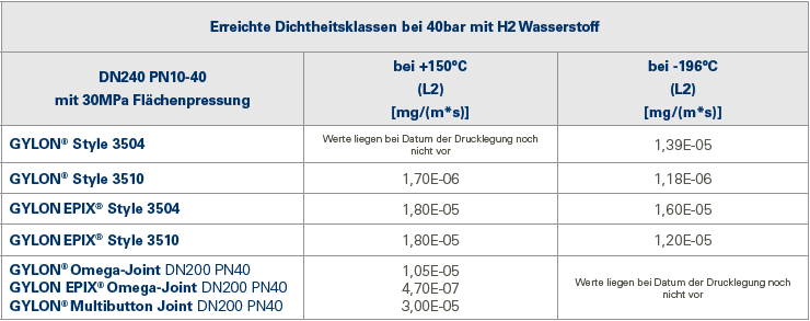 Grundsätzlich gilt, dass die GYLON® PTFE Dichtungen der dritten Generation bereits seit Dekaden im Bereich H2 (Wasserstoff) eingesetzt werden und deren technische Dichtheit außer Frage steht, da die derzeitigen Beprobungen der gängigen EN 13555 Dichtungskennwerte mit dem wesentlich kleineren Molekül Helium erfolgte.
