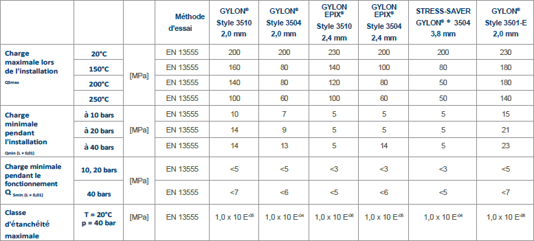 Les types de joints GYLON® et GYLON EPIX® ont été stockés comme suit: