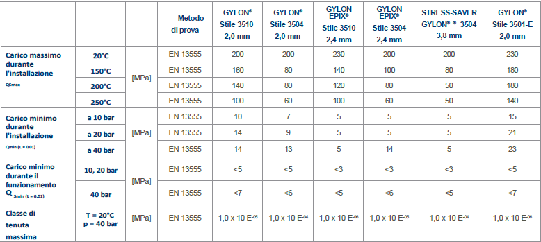 I tipi di guarnizione GYLON® e GYLON EPIX® sono stati memorizzati come segue: